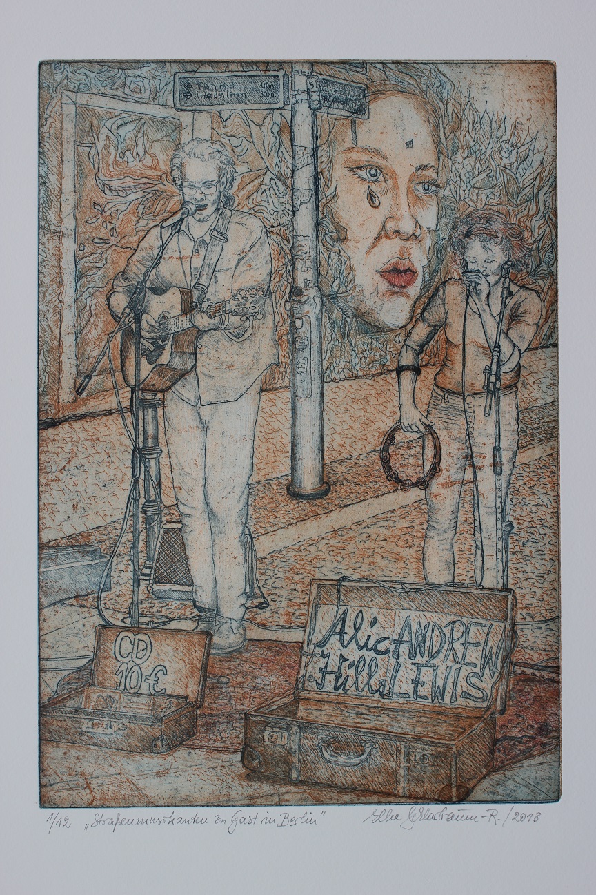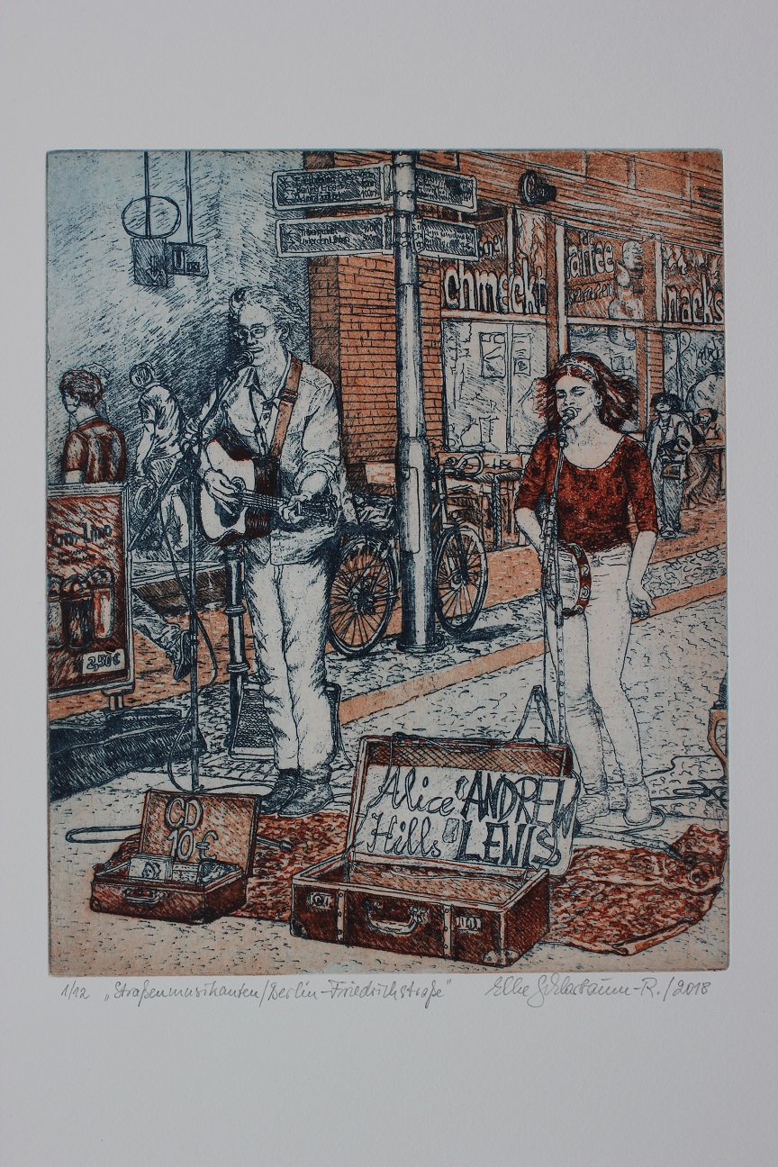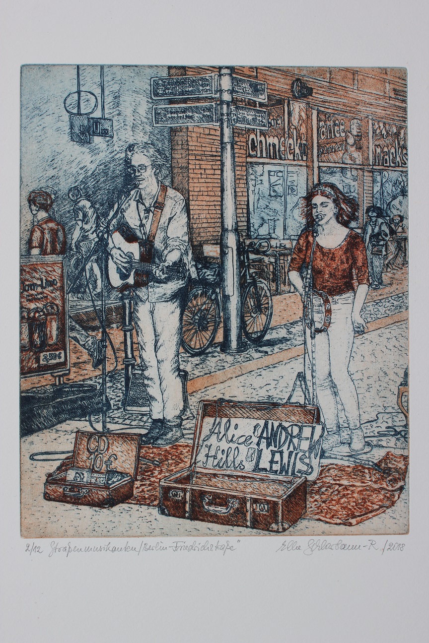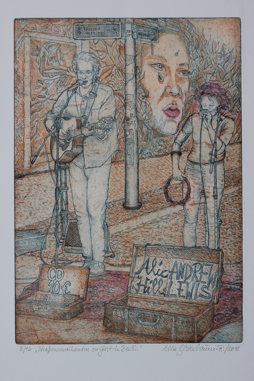 Elke Schlarbaum-Riede / Farbradierungen zur Serie: Straßenmusikanten